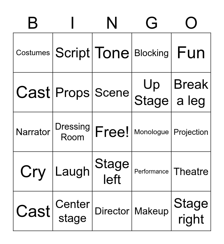 This bingo card has a free space and 29 words: Cast, Actor, Dressing Room, Audition, Costumes, Tone, Props, Laugh, Monologue, Center stage, Projection, Stage right, Director, Makeup, Break a leg, Downstage, Stage left, Cry, Fun, Narrator, Performance, Brave, Up Stage, Cast, Blocking, Script, Theatre, Scene and Improv.