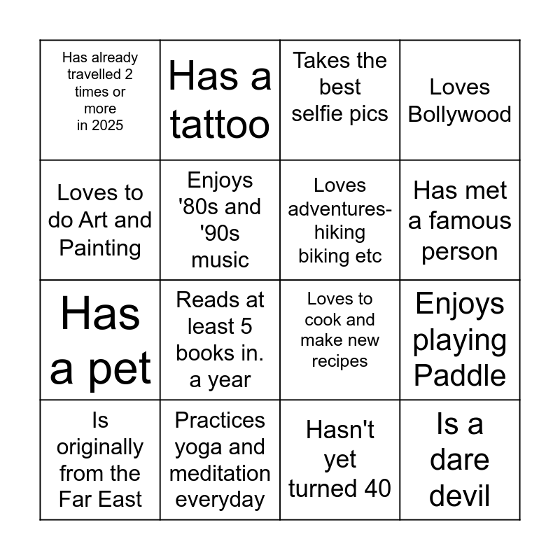 This bingo card has 20 words: Enjoys playing Paddle, collects something unique, Takes the best selfie pics, Volunteers for charity projects, Is originally from the Far East, Loves to do Art and Painting, Practices yoga and meditation everyday, Has already travelled 2 times or more in 2025, Has a pet, Has a tattoo, Reads at least 5 books in. a year, Loves to cook and make new recipes, Enjoys '80s and '90s music, Is a dare devil, Loves adventures- hiking biking etc, Enjoys playing cards, Has met a famous person, Loves Bollywood, Hasn't yet turned 40 and Speaks the least.
