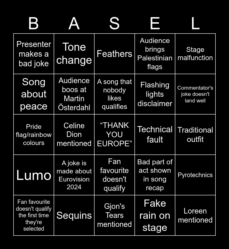 This bingo card has a free space and 39 words: Nemo mentioned, "YKSI KAKSI KOLME SAUNA", Audience sings along, Audience boos at Martin Österdahl, Fan favourite doesn't qualify the first time they're selected, Fan favourite doesn't qualify, A song that nobody likes qualifies, Costume change, Stage malfunction, Lumo, Celine Dion mentioned, Audience brings Palestinian flags, Loreen mentioned, Traditional outfit, Technical fault, A joke is made about Eurovision 2024, Presenter awkwardly fills time, Presenter makes a bad joke, "Good morning Australia", Bad part of act shown in song recap, Song about peace, Gjon's Tears mentioned, Flashing lights disclaimer, Commentator's joke doesn't land well, Multilingual song, Stage invader, Sausage appears on stage, Backing dancers, Voice crack, Tone change, "Let the Eurovision Song Contest begin", Presenter mixes up their words, Feathers, Sequins, Fake rain on stage, Presenters singing, Pyrotechnics, Pride flag/rainbow colours and Artist smuggles in flag.