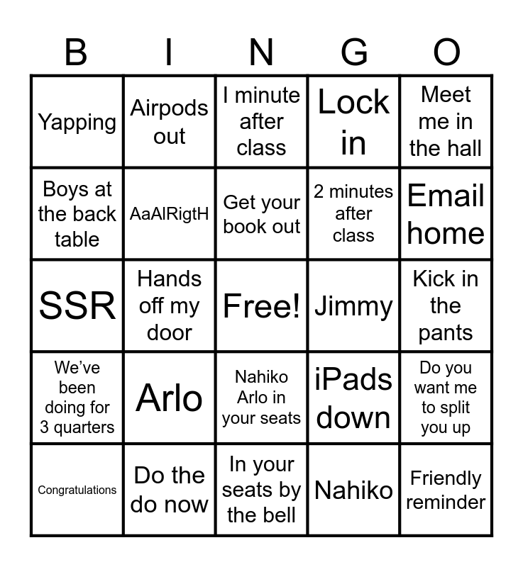 This bingo card has a free space and 24 words: Arlo, Do the do now, Get your book out, Congratulations, Meet me in the hall, Yapping, Boys at the back table, Airpods out, Jimmy, Nahiko Arlo in your seats, 2 minutes after class, SSR, iPads down, Do you want me to split you up, AaAlRigtH, Nahiko, Kick in the pants, I minute after class, Email home, Hands off my door, Friendly reminder, We’ve been doing for 3 quarters, Lock in and In your seats by the bell.