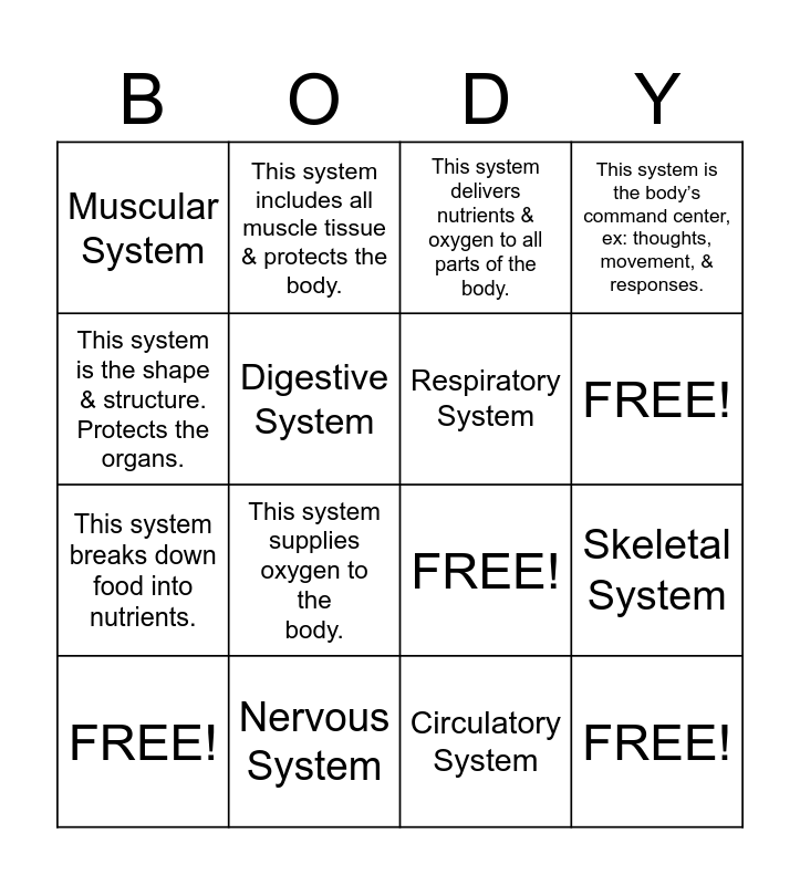 This bingo card has 16 words: Nervous System, Skeletal System, This system delivers nutrients & oxygen to all parts of the body., Muscular System, This system breaks down food into nutrients., This system includes all muscle tissue & protects the body., FREE!, Circulatory System, This system is the shape & structure. Protects the organs., Digestive System, FREE!, This system is the body’s command center, ex: thoughts, movement, & responses., This system supplies oxygen to the body., FREE!, Respiratory System and FREE!.