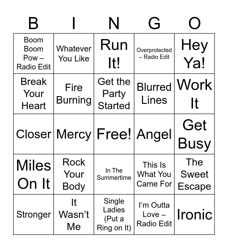This bingo card has a free space and 45 words: Where Is The Love?, Ironic, Fighter, Stronger, Love Don’t Cost a Thing, I’m Outta Love – Radio Edit, Run It!, Don’t Want You Back, Hey Ya!, It Wasn’t Me, Overprotected – Radio Edit, Angel, In The Summertime, Rock Your Body, Umbrella, Single Ladies (Put a Ring on It), Drops of Jupiter (Tell Me), Closer, The Way You Move – Radio Mix, Work It, Whatever You Like, So What, Live Your Life, Boom Boom Pow – Radio Edit, Promiscuous, Get Busy, SOS, Worth It, This Is What You Came For, Miles On It, Give Your Heart a Break, The Sweet Escape, Dynamite, Who Let The Dogs Out, Everytime We Touch, Mercy, The Way I Are, Thnks fr th Mmrs, Wild Ones, Get the Party Started, Break Your Heart, Blurred Lines, Country Grammar (Hot…), Fire Burning and Glamorous.