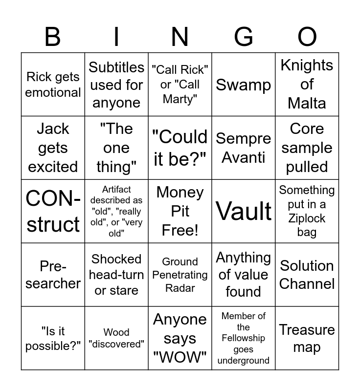 This bingo card has a free space and 24 words: Shocked head-turn or stare, Wood "discovered", "Could it be?", "Is it possible?", Knights of Malta, Rick gets emotional, Jack gets excited, Subtitles used for anyone, Vault, Ground Penetrating Radar, Sempre Avanti, CON-struct, Anything of value found, Solution Channel, "The one thing", Member of the Fellowship goes underground, Something put in a Ziplock bag, "Call Rick" or "Call Marty", Core sample pulled, Artifact described as "old", "really old", or "very old", Treasure map, Pre-searcher, Swamp and Anyone says "WOW".