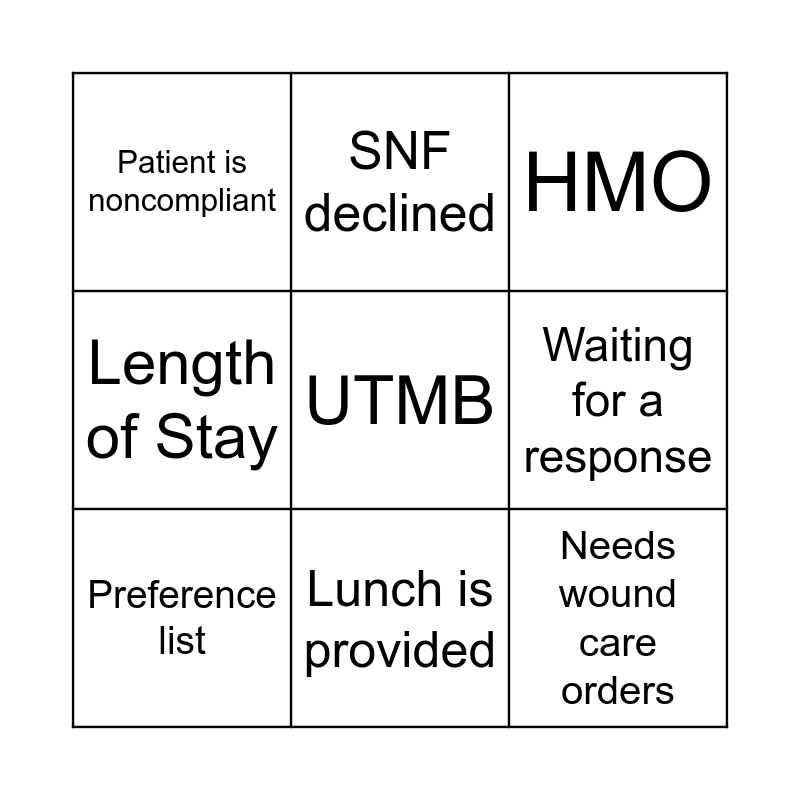 This bingo card has 49 words: Problem Solver, Called APS, Patient left AMA, Wound Vac, Needs Appeal, Rehab referral, SNF declined, 3 midnight stay required, Waiting for a response, Self Pay, Preference list, Length of Stay, Home Health Referral, Discharge Appeal, DME, Case Conference, Lunch is provided, LTACH referral, Triwest Only, UTMB, No PCP, Waiting on PT recs, Patient is noncompliant, Needs wound care orders, Frequent Flyer, Unfunded, I don't have a ride, I have Medicare..., NPO, I don't like the food here, Midnight admission, GSW, MVC, No Orders, Home Visit, has a sitter, Patient is a nurse, Care Plan, Combative, DNR, ETOH, work-life balance, No over time, Out of Network, Cultures Pending, HMO, Sepsis, Gave Report and Trauma.