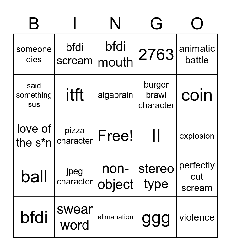 This bingo card has a free space and 24 words: bfdi, jpeg character, algabrain, ggg, animatic battle, someone dies, bfdi scream, bfdi mouth, II, explosion, love of the s*n, itft, stereo type, perfectly cut scream, said something sus, swear word, elimanation, 2763, coin, ball, pizza character, non-object, burger brawl character and violence.