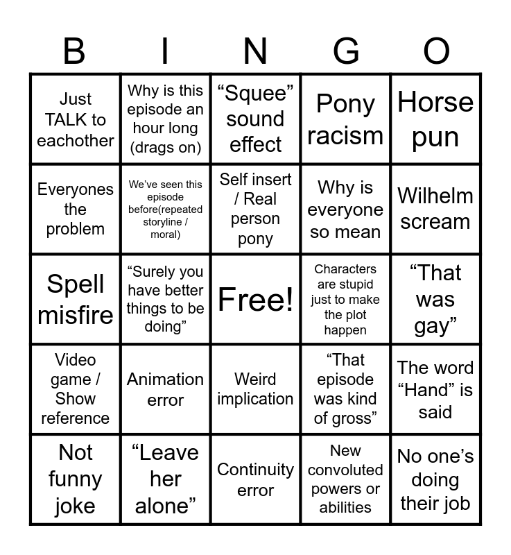 This bingo card has a free space and 50 words: Applejack lies / Rainbow Dash isn’t loyal, No one’s doing their job, Child endangerment, Continuity error, Animation error, Forced resolution/redemption, Why is this episode an hour long (drags on), Botched moral, Everyones the problem, Poorly worded, We’ve seen this episode before(repeated storyline / moral), Pony racism, The word “Hand” is said, “That episode was kind of gross”, A surprisingly good episode, Spike being annoying, Self insert / Real person pony, Characters are stupid just to make the plot happen, Actual war crimes, Horse pun, “Surely you have better things to be doing”, New convoluted powers or abilities, Just TALK to eachother, Why is everyone so mean, FNAF sound effect, Neigh sound effect, Wilhelm scream, Good visual gag, “Squee” sound effect, Weird implication, Mary sue, Discord actually being really smart and solving the plot, Song/Singing, Spike is treated like a slave, “Leave her alone”, Breaking and entering, Twilight tweaking, Someone should have died, Flying or magic would easily solve the problem but it suddenly doesn’t work, “That was gay”, Second hand embarrasment, Nerd alert, Pinkie being Pinkie, “My little pony” is said (NOT in the theme song), Not funny joke, Spell misfire, “Where are your parents”, Main character acts out of character, Video game / Show reference and Retconned lore.