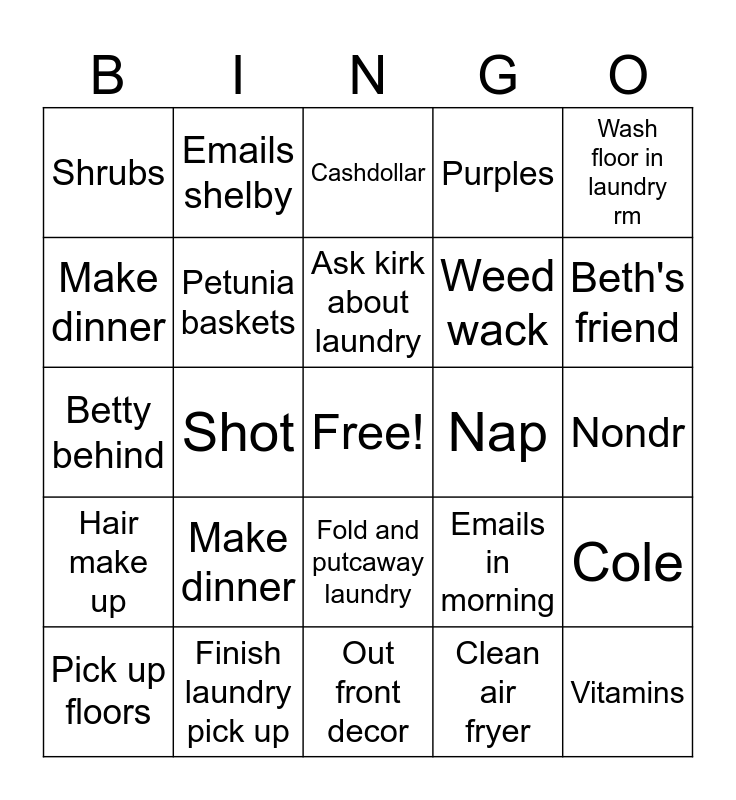 This bingo card has a free space and 24 words: Make dinner, Finish laundry pick up, Ask kirk about laundry, Pick up floors, Wash floor in laundry rm, Shrubs, Make dinner, Emails shelby, Nap, Fold and putcaway laundry, Weed wack, Betty behind, Emails in morning, Cole, Petunia baskets, Clean air fryer, Nondr, Cashdollar, Beth's friend, Shot, Vitamins, Hair make up, Purples and Out front decor.