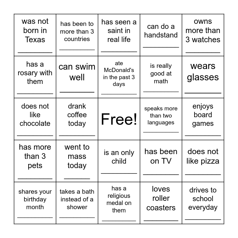 This bingo card has a free space and 24 words: went to mass today ______, takes a bath instead of a shower __________, ate McDonald's in the past 3 days ___________, shares your birthday month __________, owns more than 3 watches ________, was not born in Texas ________, has a rosary with them _________, has been to more than 3 countries __________, speaks more than two languages ___________, is an only child _________, is really good at math __________, does not like chocolate _________, has been on TV ________, does not like pizza ________, can swim well _______, loves roller coasters ________, enjoys board games _________, has seen a saint in real life _________, wears glasses _______, drank coffee today _________, drives to school everyday _________, has more than 3 pets ________, can do a handstand _________ and has a religious medal on them __________.