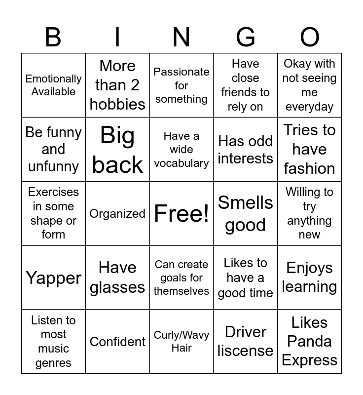 This bingo card has a free space and 24 words: Have glasses, Confident, Have a wide vocabulary, Listen to most music genres, Okay with not seeing me everyday, Emotionally Available, Be funny and unfunny, More than 2 hobbies, Smells good, Can create goals for themselves, Has odd interests, Exercises in some shape or form, Likes to have a good time, Enjoys learning, Big back, Driver liscense, Willing to try anything new, Passionate for something, Tries to have fashion, Organized, Likes Panda Express, Yapper, Have close friends to rely on and Curly/Wavy Hair.
