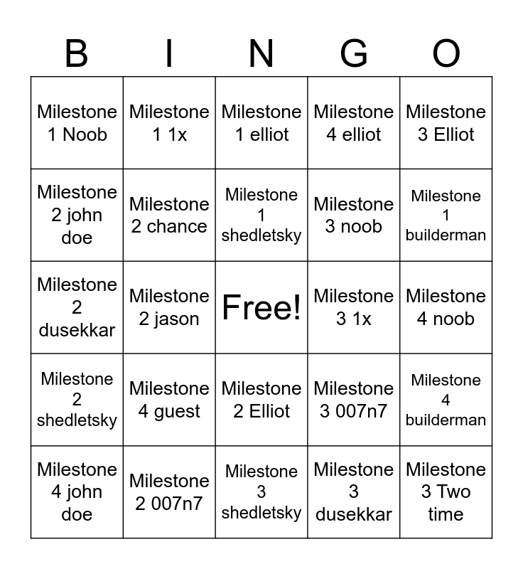 This bingo card has a free space and 24 words: Milestone 4 guest, Milestone 2 007n7, Milestone 1 shedletsky, Milestone 4 john doe, Milestone 3 Elliot, Milestone 1 Noob, Milestone 2 john doe, Milestone 1 1x, Milestone 3 1x, Milestone 2 Elliot, Milestone 3 noob, Milestone 2 dusekkar, Milestone 3 007n7, Milestone 4 builderman, Milestone 2 chance, Milestone 3 dusekkar, Milestone 4 noob, Milestone 1 elliot, Milestone 1 builderman, Milestone 2 jason, Milestone 3 Two time, Milestone 2 shedletsky, Milestone 4 elliot and Milestone 3 shedletsky.
