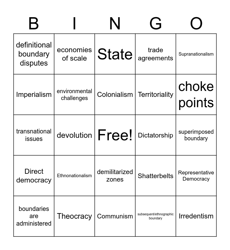 This bingo card has a free space and 77 words: political entities, independent, State, Federation, Nation, Nation-state, Stateless nations, Multinational states, multistate nations, Autonomous regions and semi-autonomous regions, Sovereignty, Self determination, Colonialism, Imperialism, independence movements, devolution, Balkanization, Irredentism, ethnic separatism, Supranationalism, democratization, transnational issues, environmental challenges, economies of scale, trade agreements, military alliances, United Nations (UN), North Atlantic Treaty Organization (NATO), European Union (EU), Association of Southeast Asian Nations (ASEAN), Arctic Council, African Union, Neocolonialism, Shatterbelts, choke points, Territoriality, Political power, relic boundary, superimposed boundary, subsequent/ethnographic boundary, antecedent boundary, geometric boundary, consequent boundaries boundary, boundaries are defined, boundaries are delimited, boundaries are demarcated, boundaries are administered, definitional boundary disputes, locational boundary disputes, operational boundary disputes, allocational boundary disputes, demilitarized zones, Policy, Law of the Sea, gerrymandering, failed states, uneven development, ethnic nationalist movements, Centrifugal, Centripetal, Ethnonationalism, more equitable infrastructure development, increased cultural cohesion, Government, governance, Authoritarianism, Totalitarianism, Dictatorship, Monarchy, Oligarchy, Parliamentary, Representative Democracy, Direct democracy, Theocracy, Anarchy, Communism and Socialism.