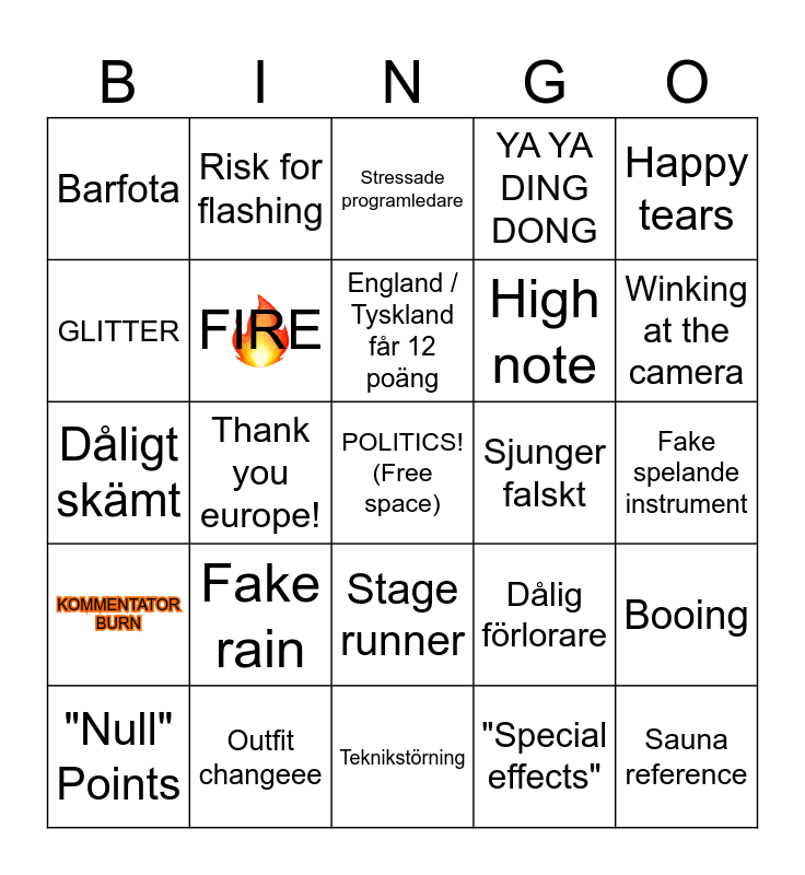 This bingo card has 2 images, a free space and 29 words: "Null" Points, Wind machine, Thank you europe!, Sob story, Barfota, Stressade programledare, FIRE, Fake rain, Sjunger falskt, Outfit changeee, Fake spelande instrument, Sauna reference, Teknikstörning, "Special effects", Winking at the camera, CAMEO, Stage runner, KOMMENTATOR BURN, Happy tears, Dåligt skämt, Dålig förlorare, EMO, High note, GLITTER, YA YA DING DONG, Risk for flashing, Booing, England / Tyskland får 12 poäng and Schweiz reference.
