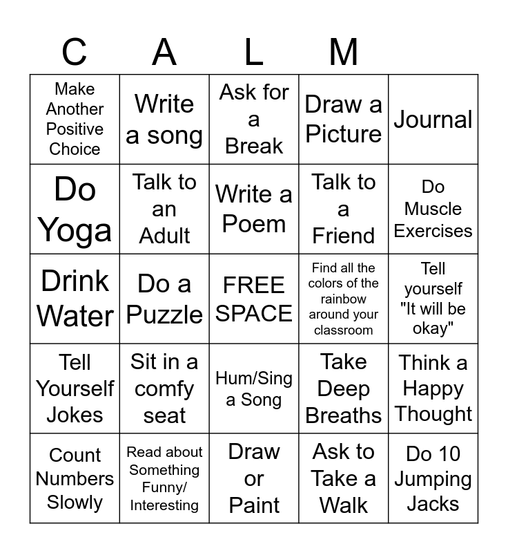 This bingo card has a free space and 24 words: Sit in a comfy seat, Read about Something Funny/ Interesting, Write a Poem, Count Numbers Slowly, Journal, Make Another Positive Choice, Do Yoga, Write a song, Find all the colors of the rainbow around your classroom, Hum/Sing a Song, Talk to a Friend, Drink Water, Take Deep Breaths, Think a Happy Thought, Talk to an Adult, Ask to Take a Walk, Tell yourself "It will be okay", Ask for a Break, Do Muscle Exercises, Do a Puzzle, Do 10 Jumping Jacks, Tell Yourself Jokes, Draw a Picture and Draw or Paint.