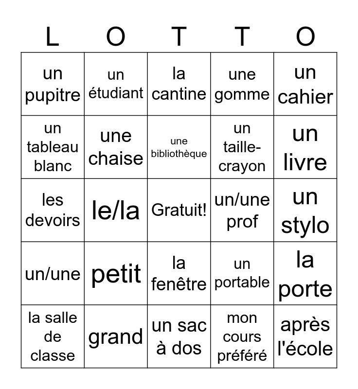This bingo card has a free space and 24 words: petit, grand, une bibliothèque, la salle de classe, un cahier, un pupitre, un tableau blanc, un étudiant, un/une prof, la fenêtre, un taille-crayon, les devoirs, un portable, la porte, une chaise, mon cours préféré, un stylo, la cantine, un livre, le/la, après l'école, un/une, une gomme and un sac à dos.