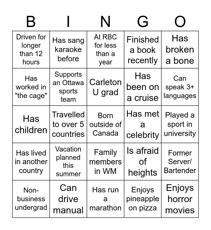 This bingo card has a free space and 33 words: Has a sibling, Plays a sport, Travelled to over 5 countries, Has a dog, Has lived in another country, Supports an Ottawa sports team, Has broken a bone, Non-business undergrad, Has sang karaoke before, Has been with RBC for 10+ years, Carleton U grad, At RBC for less than a year, Plays a musical intrument, Is left handed, Has met a celebrity, Can speak 3+ languages, Can drive manual, Has children, Vacation planned this summer, Is afraid of heights, Family members in WM, Has a cat, Driven for longer than 12 hours, Played a sport in university, Has run a marathon, Enjoys horror movies, Finished a book recently, Has been on a cruise, Has worked in "the cage", Former Server/ Bartender, Has performed on a stage, Enjoys pineapple on pizza and Middle Child.