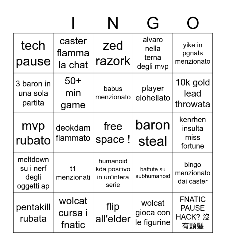 This bingo card has a free space and 24 words: t1 menzionati, wolcat cursa i fnatic, babus menzionato, pentakill rubata, yike in pgnats menzionato, tech pause, 3 baron in una sola partita, caster flamma la chat, baron steal, humanoid kda positivo in un'intera serie, player elohellato, mvp rubato, battute su subhumanoid, bingo menzionato dai caster, 50+ min game, wolcat gioca con le figurine, kenrhen insulta miss fortune, zed razork, 10k gold lead throwata, deokdam flammato, FNATIC PAUSE HACK? 沒有頭髮, meltdown su i nerf degli oggetti ap, alvaro nella terna degli mvp and flip all'elder.