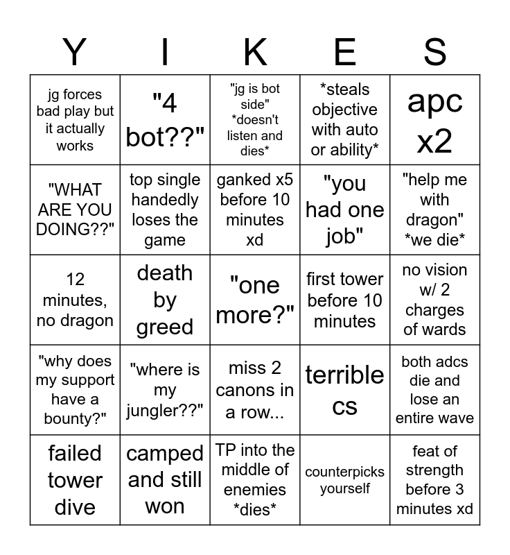 This bingo card has a free space and 24 words: "where is my jungler??", camped and still won, ganked x5 before 10 minutes xd, failed tower dive, apc x2, jg forces bad play but it actually works, "WHAT ARE YOU DOING??", "4 bot??", first tower before 10 minutes, miss 2 canons in a row..., "you had one job", 12 minutes, no dragon, terrible cs, both adcs die and lose an entire wave, top single handedly loses the game, counterpicks yourself, no vision w/ 2 charges of wards, "jg is bot side" *doesn't listen and dies*, "help me with dragon" *we die*, death by greed, feat of strength before 3 minutes xd, "why does my support have a bounty?", *steals objective with auto or ability* and TP into the middle of enemies *dies*.