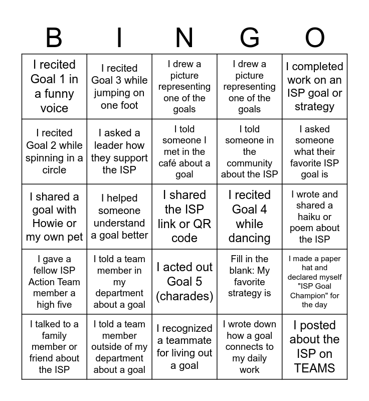 This bingo card has a free space and 24 words: I told a team member in my department about a goal, I told a team member outside of my department about a goal, I told someone I met in the café about a goal, I talked to a family member or friend about the ISP, I completed work on an ISP goal or strategy, I recited Goal 1 in a funny voice, I recited Goal 2 while spinning in a circle, I recited Goal 3 while jumping on one foot, I recited Goal 4 while dancing, I acted out Goal 5 (charades), I told someone in the community about the ISP, I shared a goal with Howie or my own pet, Fill in the blank: My favorite strategy is, I made a paper hat and declared myself "ISP Goal Champion" for the day, I asked a leader how they support the ISP, I wrote down how a goal connects to my daily work, I wrote and shared a haiku or poem about the ISP, I drew a picture representing one of the goals, I asked someone what their favorite ISP goal is, I helped someone understand a goal better, I posted about the ISP on TEAMS, I gave a fellow ISP Action Team member a high five, I drew a picture representing one of the goals and I recognized a teammate for living out a goal.