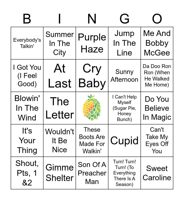 This bingo card has a free space and 44 words: Bang Bang (My Baby Shot Me Down), Sweet Caroline, Somebody To Love, Shout, Pts, 1 &2, Then He Kissed Me, Turn! Turn! Turn! (To Everything There Is A Season), Purple Haze, All Day And All Of The Night, Me And Bobby McGee, Gimme Shelter, Jump In The Line, I Can't Help Myself (Sugar Pie, Honey Bunch), These Boots Are Made For Walkin', Wouldn't It Be Nice, In The Ghetto, Son Of A Preacher Man, Louie Louie, Blowin' In The Wind, Born To Be Wild, Da Doo Ron Ron (When He Walked Me Home), Summer In The City, Suzanne, Put Your Head On My Shoulder, Everybody's Talkin', I'm A Believer, Do You Believe In Magic, Only The Lonely (Know the Way I Feel), Hey Jude, Cupid, It's Your Thing, You Can't Hurry Love, Can't Take My Eyes Off You, American Woman, Hang On Sloopy, The Letter, Runaway, America, I Say A Little Prayer, Cry Baby, I Got You (I Feel Good), Sunny Afternoon, Heart Full Of Soul, At Last and Moon River.
