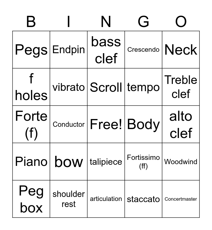 This bingo card has a free space and 24 words: bow, shoulder rest, Scroll, Peg box, Neck, Pegs, f holes, Endpin, Body, talipiece, tempo, Forte (f), Fortissimo (ff), Woodwind, vibrato, staccato, alto clef, bass clef, Treble clef, Conductor, Concertmaster, Piano, Crescendo and articulation.