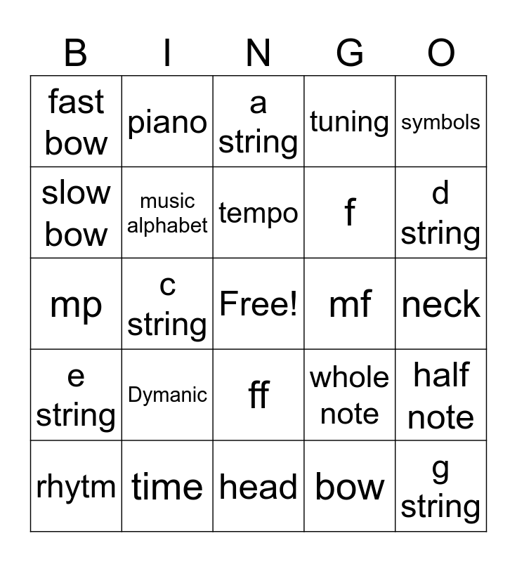 This bingo card has a free space and 24 words: Dymanic, time, tempo, rhytm, symbols, fast bow, slow bow, piano, mf, ff, f, mp, whole note, half note, music alphabet, bow, neck, a string, d string, c string, g string, e string, tuning and head.