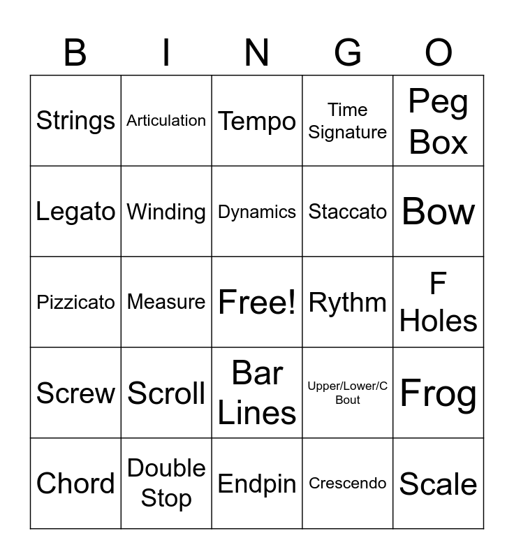This bingo card has a free space and 24 words: Scroll, Double Stop, Dynamics, Chord, Peg Box, Strings, Legato, Articulation, Rythm, Bar Lines, Staccato, Pizzicato, Upper/Lower/C Bout, Frog, Winding, Crescendo, F Holes, Tempo, Bow, Measure, Scale, Screw, Time Signature and Endpin.