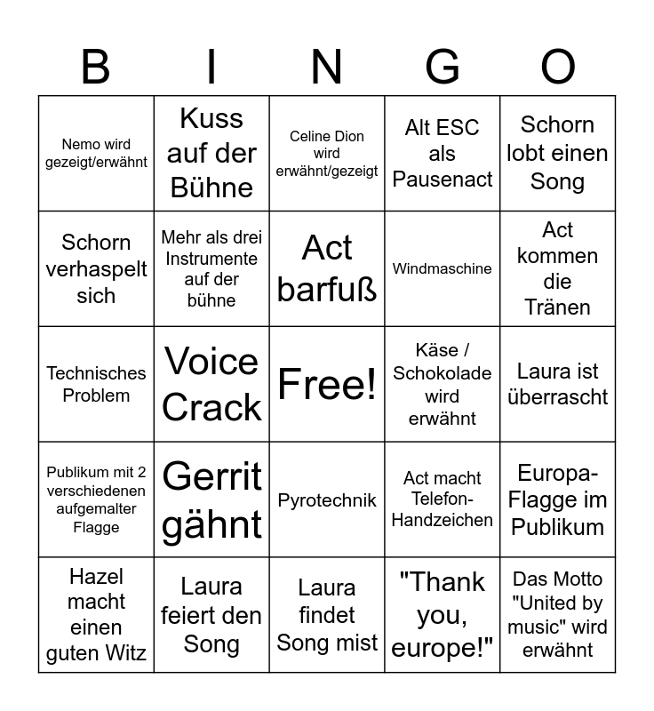 This bingo card has a free space and 24 words: Gerrit gähnt, Laura feiert den Song, Act barfuß, Hazel macht einen guten Witz, Schorn lobt einen Song, Nemo wird gezeigt/erwähnt, Schorn verhaspelt sich, Kuss auf der Bühne, Käse / Schokolade wird erwähnt, Pyrotechnik, Windmaschine, Technisches Problem, Act macht Telefon-Handzeichen, Europa-Flagge im Publikum, Mehr als drei Instrumente auf der bühne, "Thank you, europe!", Laura ist überrascht, Celine Dion wird erwähnt/gezeigt, Act kommen die Tränen, Voice Crack, Das Motto "United by music" wird erwähnt, Publikum mit 2 verschiedenen aufgemalter Flagge, Alt ESC als Pausenact and Laura findet Song mist.