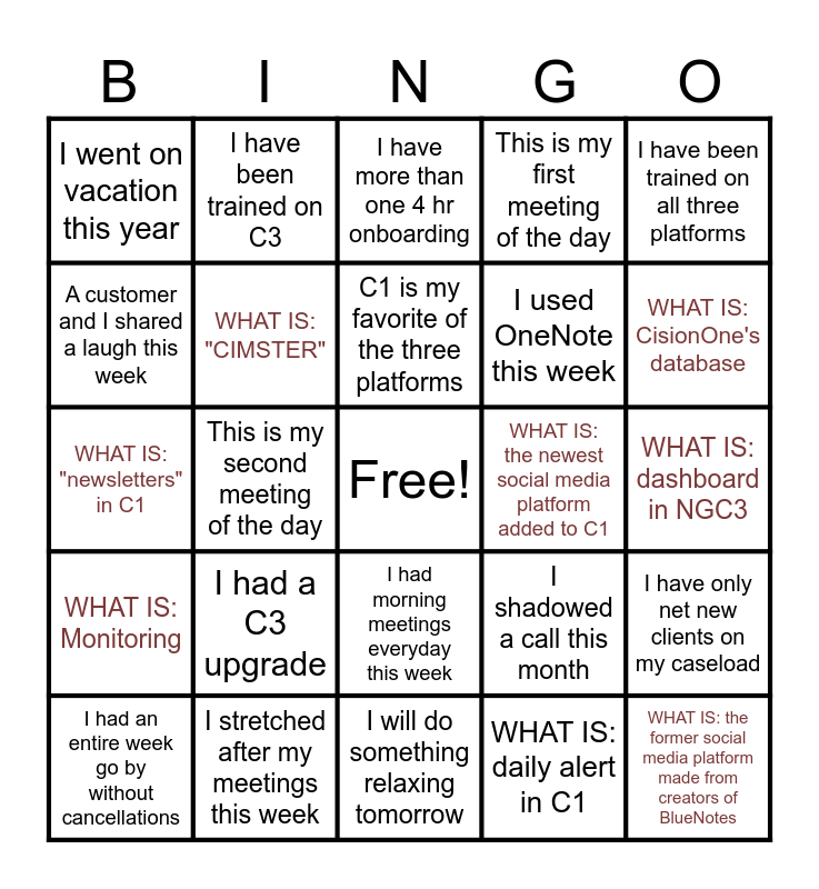 This bingo card has a free space and 29 words: I had an entire week go by without cancellations, I have never trained on C3, This is my second meeting of the day, I answered an internal question in the team chat, I went on vacation this year, I have more than one 4 hr onboarding, WHAT IS: "CIMSTER", I had a C3 upgrade, WHAT IS: the newest social media platform added to C1, I stretched after my meetings this week, WHAT IS: dashboard in NGC3, WHAT IS: the former social media platform made from creators of BlueNotes, I will do something relaxing tomorrow, WHAT IS: daily alert in C1, WHAT IS: CisionOne's database, I learned something new about C3 this week, I had morning meetings everyday this week, WHAT IS: Monitoring, I have been trained on all three platforms, WHAT IS: "newsletters" in C1, I shadowed a call this month, I can onboard using more than one language, I used OneNote this week, A customer and I shared a laugh this week, This is my first meeting of the day, I have been trained on C3, I have only net new clients on my caseload, C1 is my favorite of the three platforms and Cision is my first onboarding job.