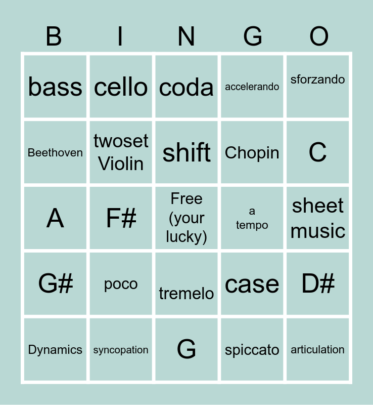 This bingo card has a free space and 44 words: Forte, articulation, Intonation, Dynamics, Tempo, spiccato, coda, divisi, sforzando, syncopation, accelerando, a tempo, tremelo, poco, subito, G, D, A, E, C, cello, violin, vola, bass, notes, sheet music, rosin, bow, case, G#, A#, D#, E#, C#, F#, C (flat), F (flat), B#, shift, Beethoven, Chopin, Bach, twoset Violin and Vivaldi.