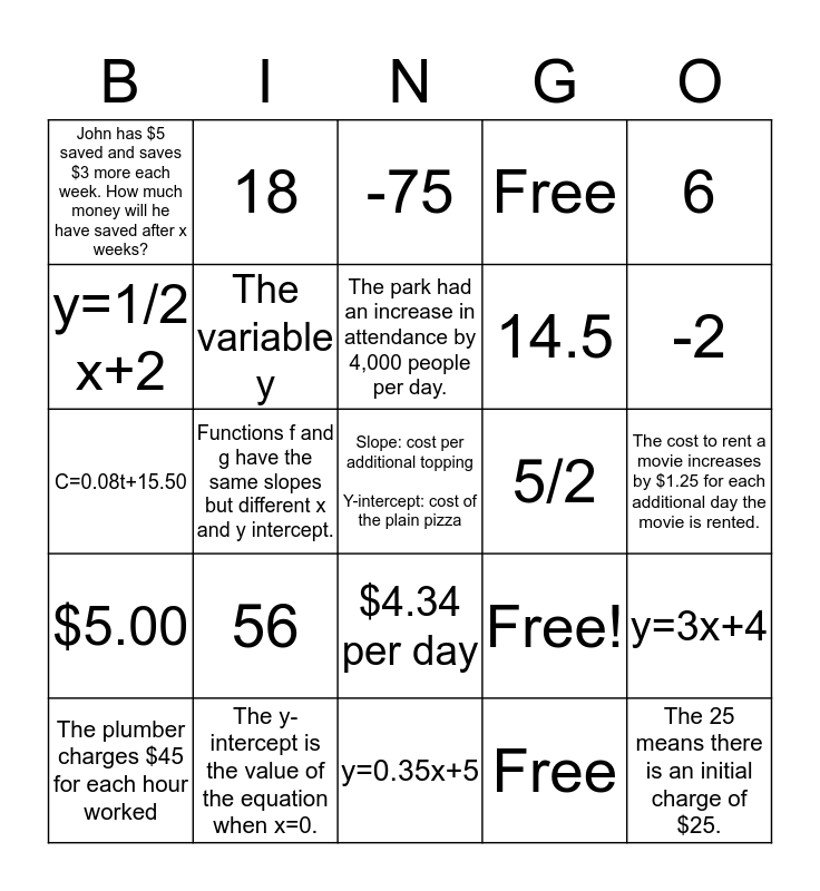 This bingo card has 25 words: 56, y=0.35x+5, The park had an increase in attendance by 4,000 people per day., The plumber charges $45 for each hour worked, 6, John has $5 saved and saves $3 more each week. How much money will he have saved after x weeks?, y=1/2 x+2, 18, 5/2, $4.34 per day, 14.5, C=0.08t+15.50, Free!, y=3x+4, The variable y, The 25 means there is an initial charge of $25., The cost to rent a movie increases by $1.25 for each additional day the movie is rented., -75, -2, Functions f and g have the same slopes but different x and y intercept., Slope: cost per additional topping Y-intercept: cost of the plain pizza, The y-intercept is the value of the equation when x=0., $5.00, Free and Free.