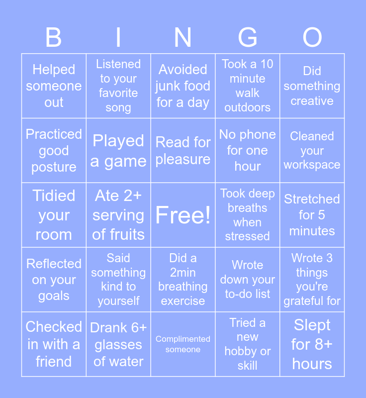 This bingo card has a free space and 24 words: Said something kind to yourself, Drank 6+ glasses of water, Read for pleasure, Checked in with a friend, Did something creative, Helped someone out, Practiced good posture, Listened to your favorite song, Took deep breaths when stressed, Did a 2min breathing exercise, No phone for one hour, Tidied your room, Wrote down your to-do list, Wrote 3 things you're grateful for, Played a game, Tried a new hobby or skill, Stretched for 5 minutes, Avoided junk food for a day, Cleaned your workspace, Ate 2+ serving of fruits, Slept for 8+ hours, Reflected on your goals, Took a 10 minute walk outdoors and Complimented someone.