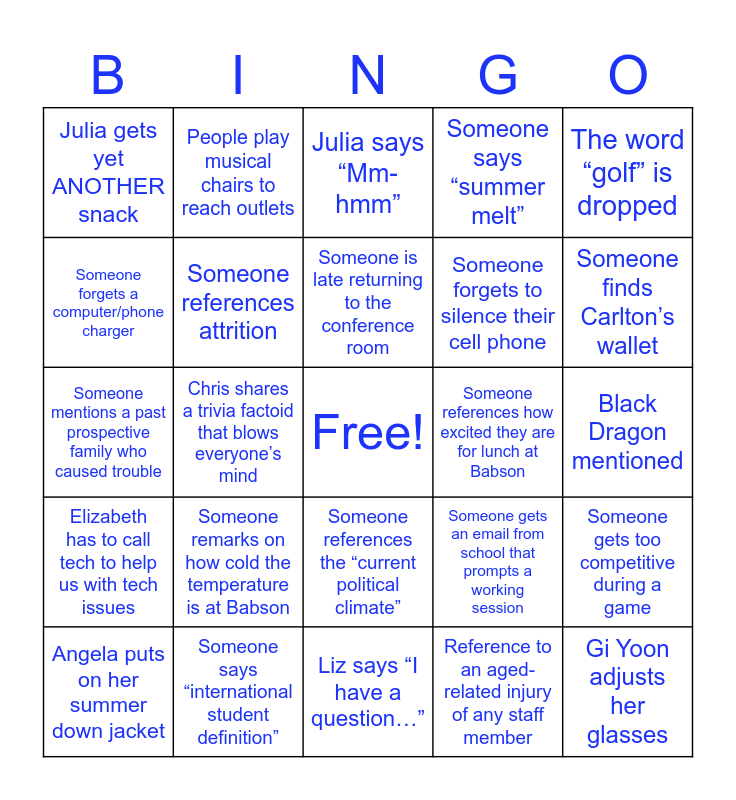 This bingo card has a free space and 29 words: Angela puts on her summer down jacket, Carlton mentions a terrible movie that he loves, Chris shares a trivia factoid that blows everyone’s mind, Someone says “full pay boarder”, Julia gets yet ANOTHER snack, Julia says “Mm-hmm”, Someone references attrition, Someone remarks on how cold the temperature is at Babson, Someone references how excited they are for lunch at Babson, Someone says “international student definition”, Black Dragon mentioned, Gi Yoon adjusts her glasses, Liz says “I have a question…”, Reference to an aged-related injury of any staff member, Someone finds Carlton’s wallet, Liz wins again for best song selection in the mystery song game, Someone references the “current political climate”, Elizabeth has to call tech to help us with tech issues, The word “golf” is dropped, Someone mentions a past prospective family who caused trouble, Someone gets an email from school that prompts a working session, Someone says “Making the Most of May”, Someone forgets to silence their cell phone, Someone forgets a computer/phone charger, Someone says “summer melt”, People play musical chairs to reach outlets, Someone gets too competitive during a game, Someone is late returning to the conference room and Someone say “Yield”.