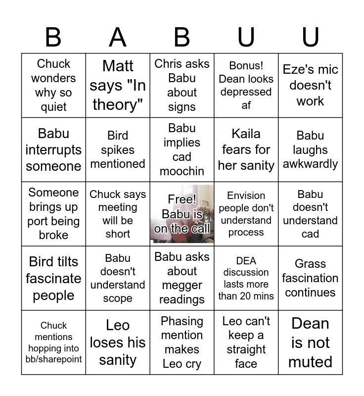 This bingo card has a free space and 24 words: Chuck mentions hopping into bb/sharepoint, Babu doesn't understand scope, Babu implies cad moochin, Leo can't keep a straight face, Eze's mic doesn't work, Chuck wonders why so quiet, Matt says "In theory", Chris asks Babu about signs, Envision people don't understand process, Babu doesn't understand cad, Someone brings up port being broke, Bird spikes mentioned, DEA discussion lasts more than 20 mins, Grass fascination continues, Babu interrupts someone, Leo loses his sanity, Phasing mention makes Leo cry, Bonus! Dean looks depressed af, Babu laughs awkwardly, Bird tilts fascinate people, Chuck says meeting will be short, Babu asks about megger readings, Kaila fears for her sanity and Dean is not muted.