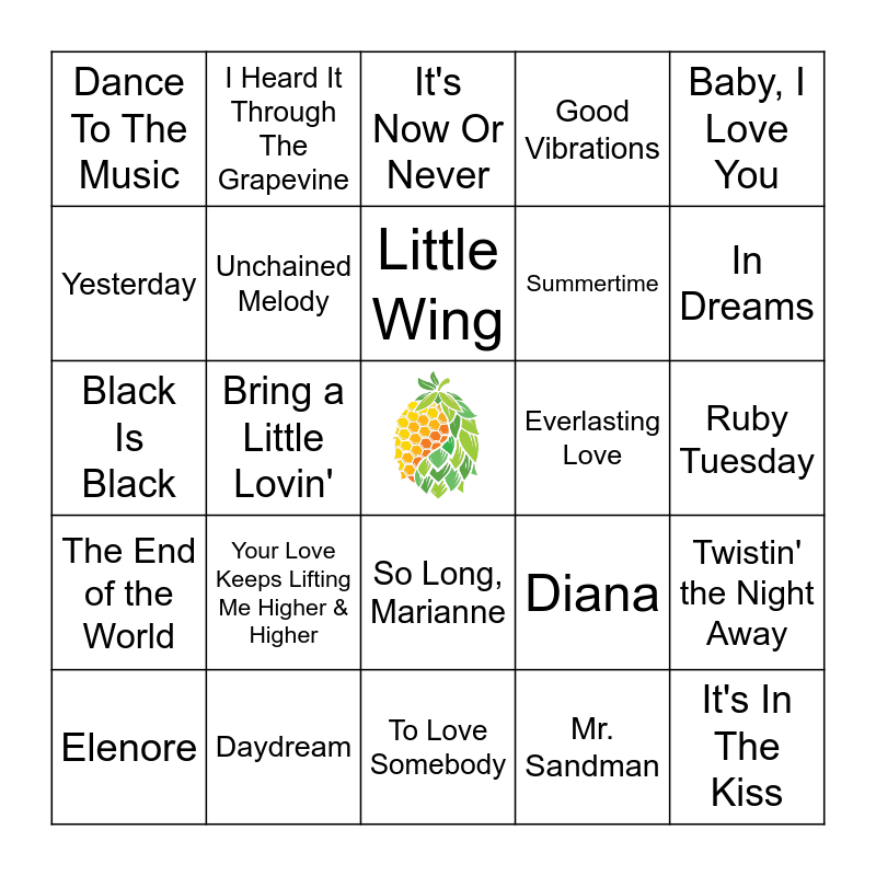 This bingo card has a free space and 41 words: Whole Lotta Love, Black Is Black, You Send Me, Unchained Melody, Daydream, So Long, Marianne, Little Wing, California Soul, Baby, I Love You, The End of the World, Bring a Little Lovin', Good Vibrations, It's In The Kiss, Ruby Tuesday, Everlasting Love, Your Love Keeps Lifting Me Higher & Higher, Didn't I (Blow Your Mind This Time), Dance To The Music, Feeling Good, It's Now Or Never, Twistin' the Night Away, Light My Fire, To Love Somebody, Summertime, Blue Velvet, Space Oddity, Mr. Sandman, I Wish I Knew How It Would Feel To Be Free, In Dreams, Everybody Loves Somebody, Stay, I Heard It Through The Grapevine, Elenore, The Weight, Diana, Yesterday, Aquarius/ Let The Sunshine In, Breaking Up Is Hard To Do, Walk On By, Sunshine Of Your Love and Gloria.