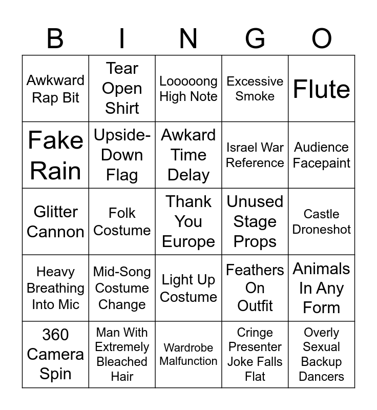 This bingo card has a free space and 24 words: Mid-Song Costume Change, Man With Extremely Bleached Hair, Awkard Time Delay, 360 Camera Spin, Flute, Awkward Rap Bit, Fake Rain, Tear Open Shirt, Unused Stage Props, Light Up Costume, Israel War Reference, Glitter Cannon, Feathers On Outfit, Animals In Any Form, Upside-Down Flag, Cringe Presenter Joke Falls Flat, Castle Droneshot, Looooong High Note, Audience Facepaint, Folk Costume, Overly Sexual Backup Dancers, Heavy Breathing Into Mic, Excessive Smoke and Wardrobe Malfunction.