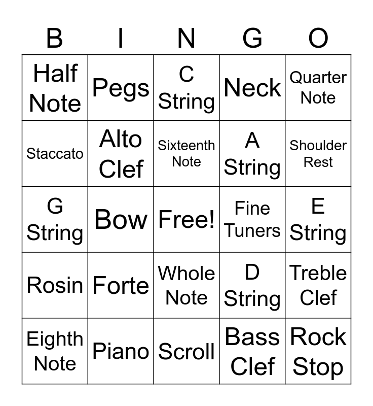 This bingo card has a free space and 24 words: Forte, Piano, Sixteenth Note, Eighth Note, Quarter Note, Half Note, Staccato, Pegs, Fine Tuners, Whole Note, A String, G String, D String, Treble Clef, Alto Clef, Bass Clef, E String, C String, Shoulder Rest, Bow, Rock Stop, Rosin, Neck and Scroll.