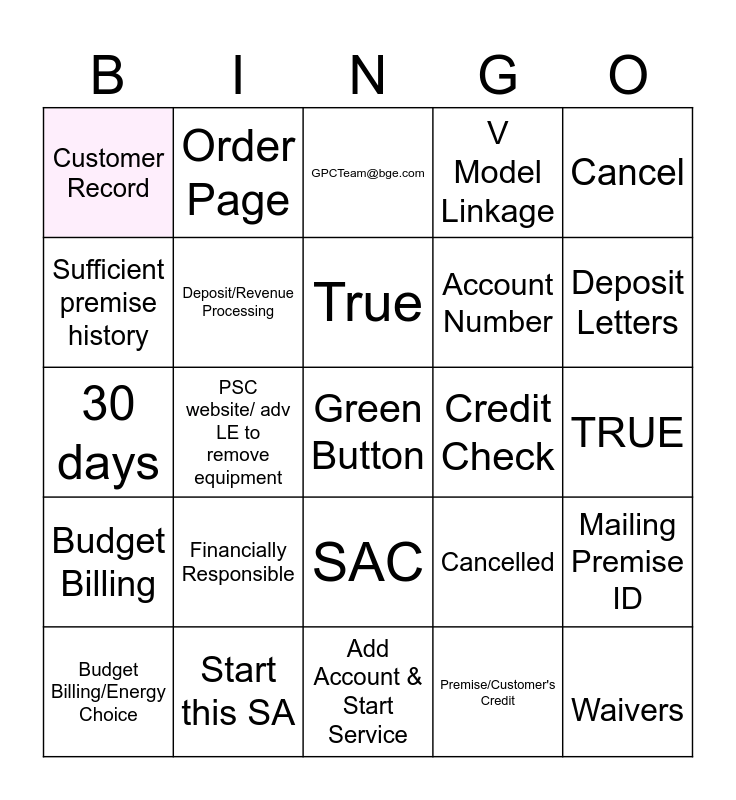 This bingo card has a free space and 24 words: Financially Responsible, Start this SA, True, Budget Billing/Energy Choice, Cancel, Customer Record, Sufficient premise history, Order Page, Credit Check, SAC, Account Number, 30 days, Cancelled, Mailing Premise ID, Deposit/Revenue Processing, Premise/Customer's Credit, TRUE, GPCTeam@bge.com, Deposit Letters, PSC website/ adv LE to remove equipment, Waivers, Budget Billing, V Model Linkage and Add Account & Start Service.