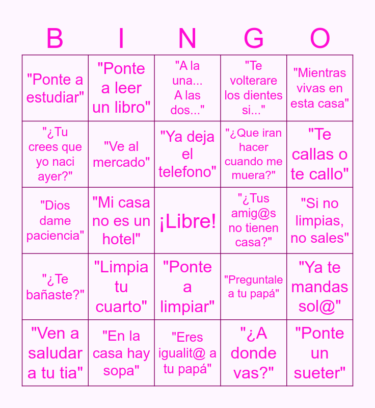 This bingo card has a free space and 24 words: "Limpia tu cuarto", "En la casa hay sopa", "Ya deja el telefono", "Ven a saludar a tu tia", "Mientras vivas en esta casa", "Ponte a estudiar", "¿Tu crees que yo naci ayer?", "Ponte a leer un libro", "¿Tus amig@s no tienen casa?", "Ponte a limpiar", "¿Que iran hacer cuando me muera?", "Dios dame paciencia", "Preguntale a tu papá", "Ya te mandas sol@", "Ve al mercado", "¿A donde vas?", "Si no limpias, no sales", "A la una... A las dos...", "Te callas o te callo", "Mi casa no es un hotel", "Ponte un sueter", "¿Te bañaste?", "Te volterare los dientes si..." and "Eres igualit@ a tu papá".