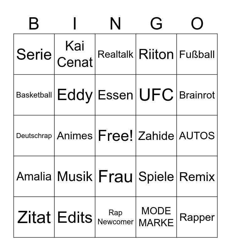 This bingo card has a free space and 24 words: Musik, Edits, Essen, Zitat, Fußball, Serie, Basketball, Kai Cenat, Zahide, Frau, UFC, Deutschrap, Spiele, Remix, Eddy, MODE MARKE, AUTOS, Realtalk, Brainrot, Animes, Rapper, Amalia, Riiton and Rap Newcomer.