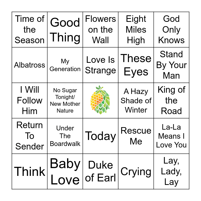 This bingo card has a free space and 60 words: Try (Just a Little Bit Harder), Baby Love, Get Together, Return To Sender, Crying, Evil Ways, My Generation, In The Year 2525, These Eyes, Downtown, Eight Miles High, For Once In My Life, Albatross, Are You Lonesome Tonight?, Spinning Wheel, Time of the Season, Lay, Lady, Lay, God Only Knows, The 59th Street Bridge Song, Love Is Strange, A Hazy Shade of Winter, Flowers on the Wall, Think, La-La Means I Love You, Build Me Up Buttercup, Oh! Carol, He's a Rebel, All I Have To Do Is Dream, Stand By Your Man, For Your Love, Rawhide, It's Not Unusual, Here Comes the Night, Thank You, Good Thing, Break on Through (To The Other Side), Can't Take My Eyes Off You, No Sugar Tonight/ New Mother Nature, I Want Candy, I Will Follow Him, A Change is Gonna Come, Under The Boardwalk, King of the Road, Both Sides Now, Rescue Me, I'm Your Puppet, Oh Happy Day, Dream a Little Dream of Me, Happy Birthday, Sweet Sixteen, Today, Duke of Earl, You Don't Own Me, I Got You Babe, Twist & Shout, Be Careful With a Fool, Green Onions, Hurdy Gurdy Man, Sleepwalk, Green Tambourine and Earth Angel.