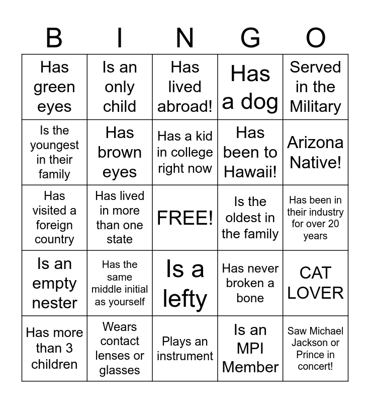This bingo card has a free space and 24 words: Has the same middle initial as yourself, Wears contact lenses or glasses, Has a kid in college right now, Has more than 3 children, Served in the Military, Has green eyes, Is the youngest in their family, Is an only child, Is the oldest in the family, Is a lefty, Has been to Hawaii!, Has visited a foreign country, Has never broken a bone, CAT LOVER, Has brown eyes, Is an MPI Member, Has been in their industry for over 20 years, Has lived abroad!, Arizona Native!, Has lived in more than one state, Saw Michael Jackson or Prince in concert!, Is an empty nester, Has a dog and Plays an instrument.