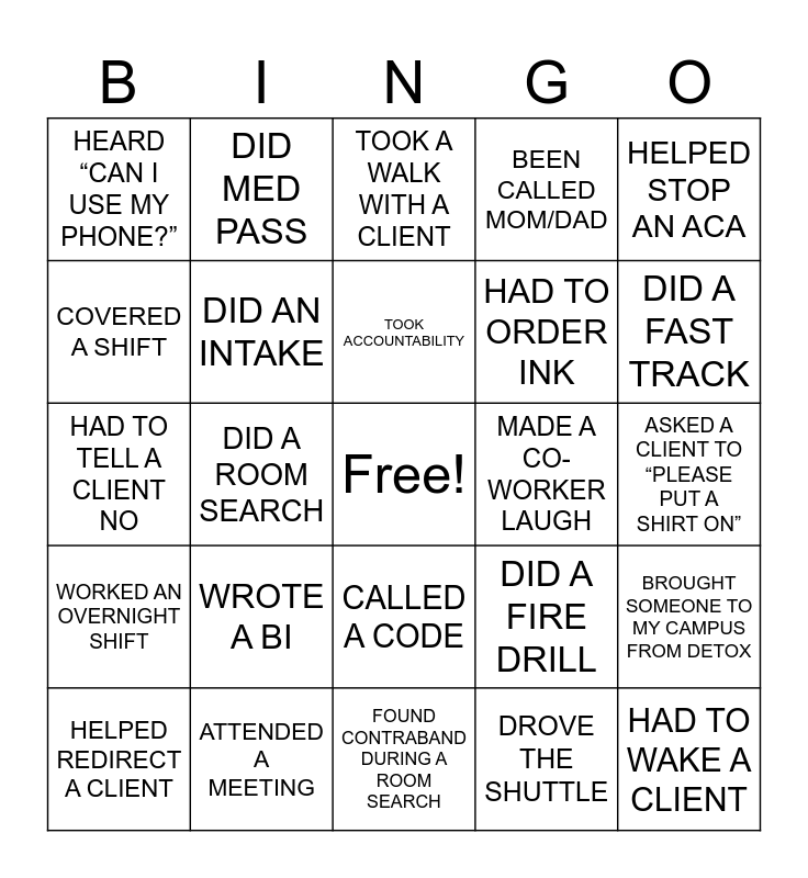 This bingo card has a free space and 24 words: WROTE A BI, ATTENDED A MEETING, TOOK ACCOUNTABILITY, HELPED REDIRECT A CLIENT, HELPED STOP AN ACA, HEARD “CAN I USE MY PHONE?”, COVERED A SHIFT, DID MED PASS, MADE A CO-WORKER LAUGH, CALLED A CODE, HAD TO ORDER INK, HAD TO TELL A CLIENT NO, DID A FIRE DRILL, BROUGHT SOMEONE TO MY CAMPUS FROM DETOX, DID AN INTAKE, DROVE THE SHUTTLE, ASKED A CLIENT TO “PLEASE PUT A SHIRT ON”, TOOK A WALK WITH A CLIENT, DID A FAST TRACK, DID A ROOM SEARCH, HAD TO WAKE A CLIENT, WORKED AN OVERNIGHT SHIFT, BEEN CALLED MOM/DAD and FOUND CONTRABAND DURING A ROOM SEARCH.