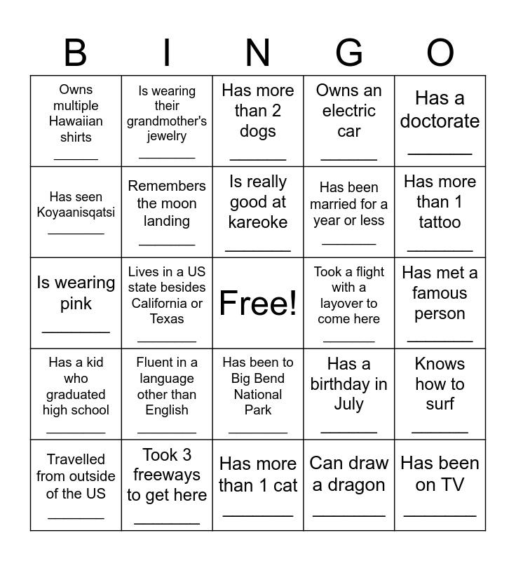 This bingo card has a free space and 29 words: Travelled from outside of the US _______, Got their outfit at a thrift store _______, Lives in a US state besides California or Texas ________, Is wearing something custom made _______, Owns multiple Hawaiian shirts ______, Has more than 2 dogs ______, Remembers the moon landing _______, Fluent in a language other than English ________, Took a flight with a layover to come here _______, Took 3 freeways to get here _______, Has met a famous person _______, Has been on TV _______, Has more than 1 cat _______, Can draw a dragon _______, Has more than 1 tattoo _______, Has been to Disneyland ________, Has been to Big Bend National Park ________, Has a kid who graduated high school ________, Has a doctorate ______, Is wearing pink _______, Has a birthday in July ______, Has been married for 50 years _______, Has been married for a year or less _______, Has seen Koyaanisqatsi ________, Owns an electric car ______, Is wearing their grandmother's jewelry ________, Knows how to surf ______, Is really good at kareoke _______ and Is wearing cowboy boots _______.