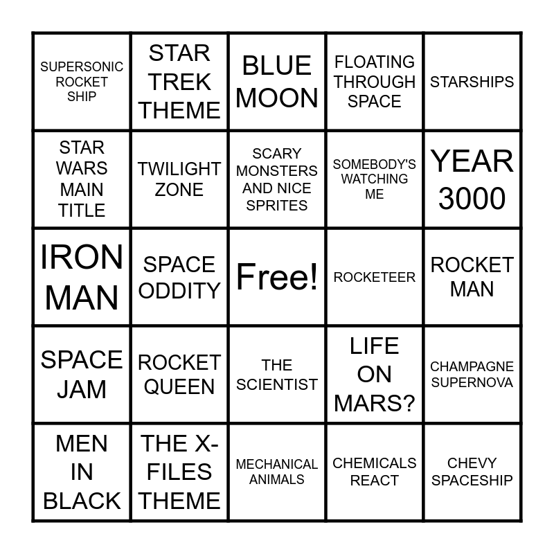 This bingo card has a free space and 41 words: MR. ROBOTO, IRON MAN, E.T., TWILIGHT ZONE, THE X-FILES THEME, THE SCIENTIST, SCARY MONSTERS AND NICE SPRITES, THRILLER, STARSHIPS, SPACE JAM, SPACE ODDITY, FLOATING THROUGH SPACE, CHEVY SPACESHIP, ROCKET MAN, ROCKETEER, ROCKET QUEEN, ROCKET, SUPERSONIC ROCKET SHIP, NEON MOON, BLUE MOON, CHAMPAGNE SUPERNOVA, STARBOY, MECHANICAL ANIMALS, SOMEBODY'S WATCHING ME, GHOSTBUSTERS, TECHNOLOGIC, CHEMICALS REACT, GALAXY SONG, YEAR 3000, THE BIG BANG THEORY THEME, ALIENS EXIST, STAR TREK THEME, MEN IN BLACK, BATTLESTAR GALACTICA THEME, LIFE ON MARS?, STAR WARS MAIN TITLE, THE IMPERIAL MARCH, TOSS A COIN TO YOUR WITCHER, KRYPTONITE, RADIOACTIVE and CRYSTALLIZE.