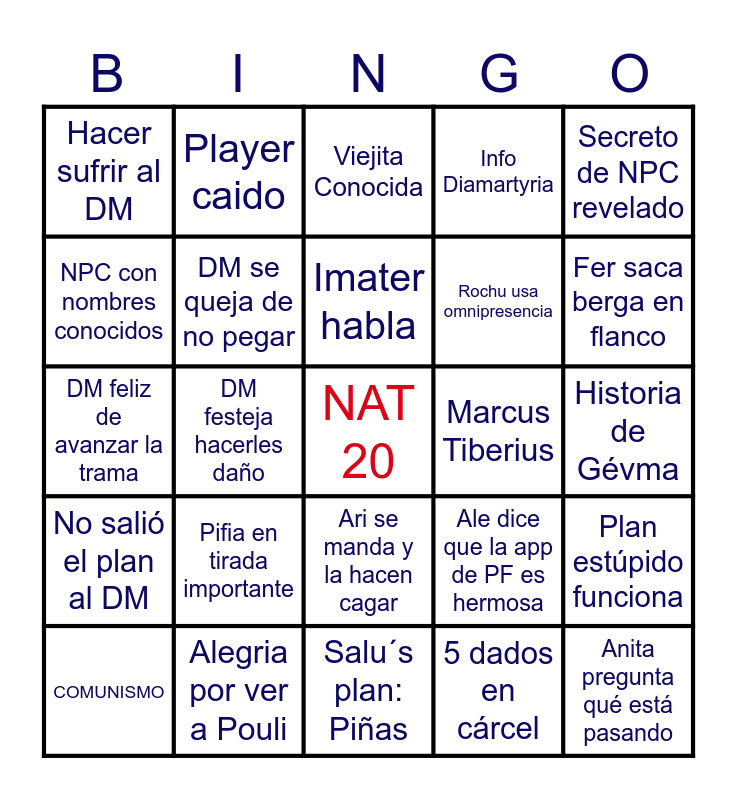 This bingo card has a free space and 24 words: Pifia en tirada importante, Alegria por ver a Pouli, Imater habla, COMUNISMO, Secreto de NPC revelado, Hacer sufrir al DM, NPC con nombres conocidos, Player caido, Marcus Tiberius, Ari se manda y la hacen cagar, Rochu usa omnipresencia, DM feliz de avanzar la trama, Ale dice que la app de PF es hermosa, Plan estúpido funciona, DM se queja de no pegar, 5 dados en cárcel, Historia de Gévma, Viejita Conocida, Fer saca berga en flanco, DM festeja hacerles daño, Anita pregunta qué está pasando, No salió el plan al DM, Info Diamartyria and Salu´s plan: Piñas.