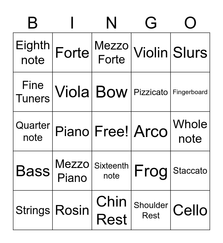 This bingo card has a free space and 24 words: Mezzo Piano, Rosin, Bow, Strings, Slurs, Eighth note, Fine Tuners, Forte, Arco, Sixteenth note, Pizzicato, Quarter note, Frog, Staccato, Viola, Shoulder Rest, Whole note, Mezzo Forte, Fingerboard, Piano, Cello, Bass, Violin and Chin Rest.