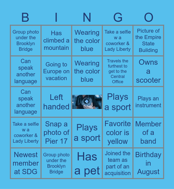⚠ This card has duplicate items: Wearing SDG swag (2), Birthday in August (2), Plays an instrument (2), Has a pet (2), Snap a photo of Pier 17 (2), Name & define a SDG Fundamental (2), Has climbed a mountain (2), Newest member at SDG (2), Can speak another language (2), Has been on TV (2), Going to Europe on vacation (2), Take a selfie w a coworker & Lady Liberty (2), Member of a band (2), Favorite color is yellow (2), Owns a scooter (2), Longest tenure at SDG (2), Wearing the color blue (2), Plays a sport (2), Selfie w One World Trade Center (2), Picture of the Empire State Building (2), Left handed (2), Joined the team as part of an acquisition (2), Group photo under the Brooklyn Bridge (2), Photo of the Staten Island Ferry (2)
