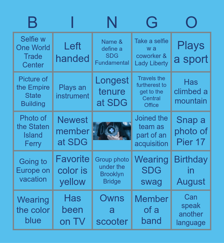 This bingo card has a free space and 25 words: Favorite color is yellow, Owns a scooter, Longest tenure at SDG, Wearing the color blue, Plays a sport, Selfie w One World Trade Center, Picture of the Empire State Building, Left handed, Joined the team as part of an acquisition, Group photo under the Brooklyn Bridge, Travels the furtherest to get to the Central Office, Photo of the Staten Island Ferry, Wearing SDG swag, Birthday in August, Plays an instrument, Has a pet, Snap a photo of Pier 17, Name & define a SDG Fundamental, Has climbed a mountain, Newest member at SDG, Can speak another language, Has been on TV, Going to Europe on vacation, Take a selfie w a coworker & Lady Liberty and Member of a band.