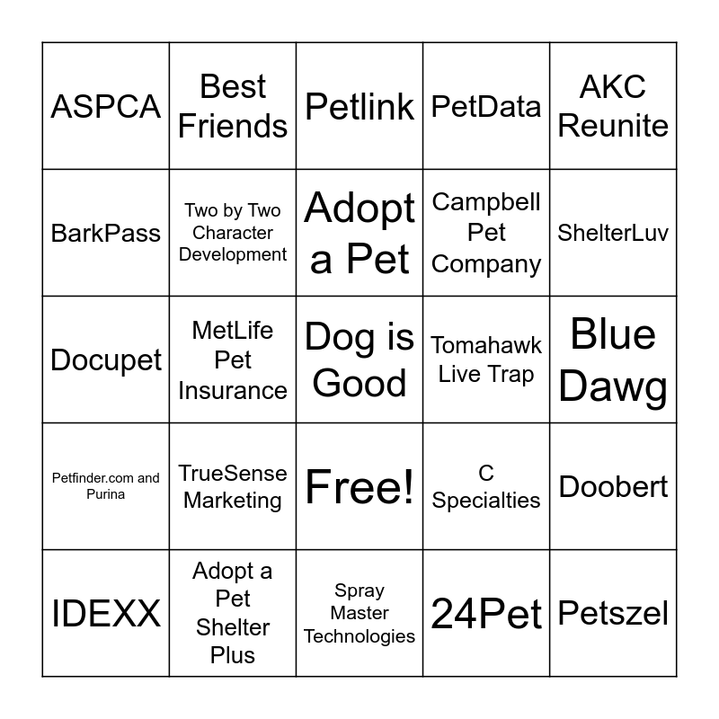 This bingo card has a free space and 26 words: Free!, 24Pet, Adopt a Pet, Adopt a Pet Shelter Plus, AKC Reunite, ASPCA, BarkPass, Best Friends, Blue Dawg, C Specialties, Campbell Pet Company, Docupet, Doobert, IDEXX, MetLife Pet Insurance, NACA, PetData, Petfinder.com and Purina, Petlink, Petszel, ShelterLuv, Spray Master Technologies, Tomahawk Live Trap, TrueSense Marketing, Two by Two Character Development and Young Living Essential Oils.