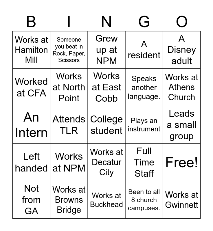 This bingo card has 28 words: Free!, Been to "The Walk", Speaks another language., Been to all 8 church campuses., Worked at CFA, Grew up at NPM, Someone you beat in Rock, Paper, Scissors, Left handed, Plays an instrument, Not from GA, An Intern, A resident, Works at Browns Bridge, Works at Buckhead, Works at Athens Church, Works at Woodstock City, Works at NPM, Works at North Point, Works at East Cobb, Works at Decatur City, Works at Hamilton Mill, Works at Gwinnett, College student, Attends TLR, Leads a small group, Full Time Staff, A Disney adult and Married/a parent.